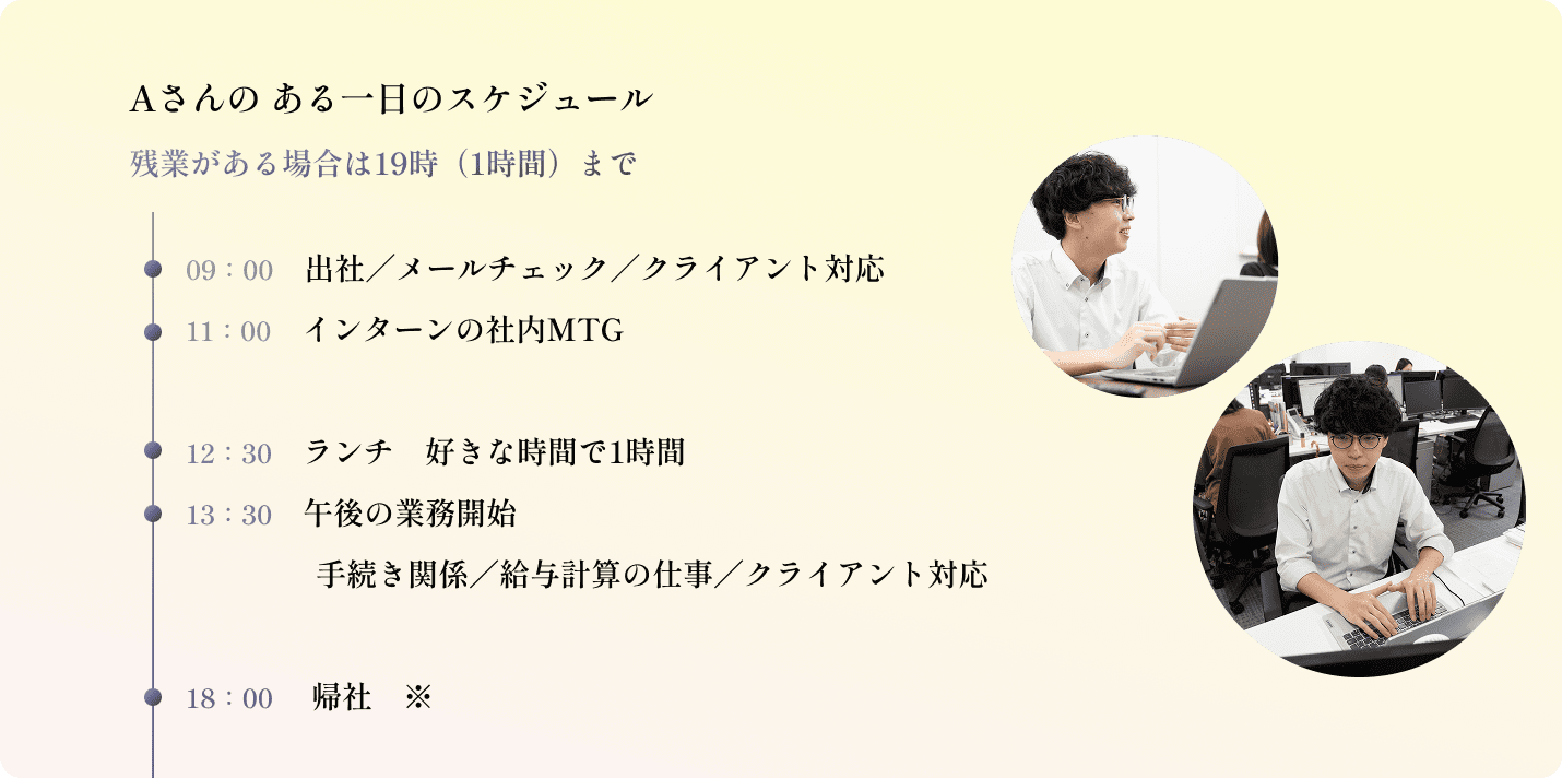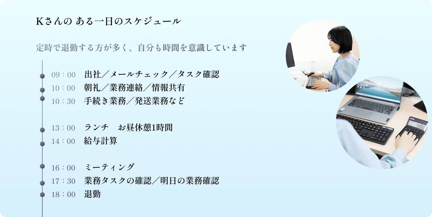担当する企業の給与計算、社会保険・労働保険手続き、労務相談など、社労士としての業務がメインですが、現在はインターンチームや、ホームページリニューアルプロジェクトの一員としても活動しています。
