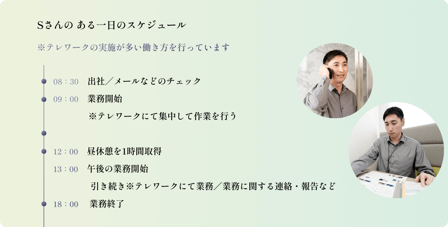 私の場合、通常は8:30に出社して事務作業や打ち合わせをこなしています。一方で締め切りが近い仕事を抱えていたり、集中して作業がしたい場合には、自宅で※テレワークをすることもあります。